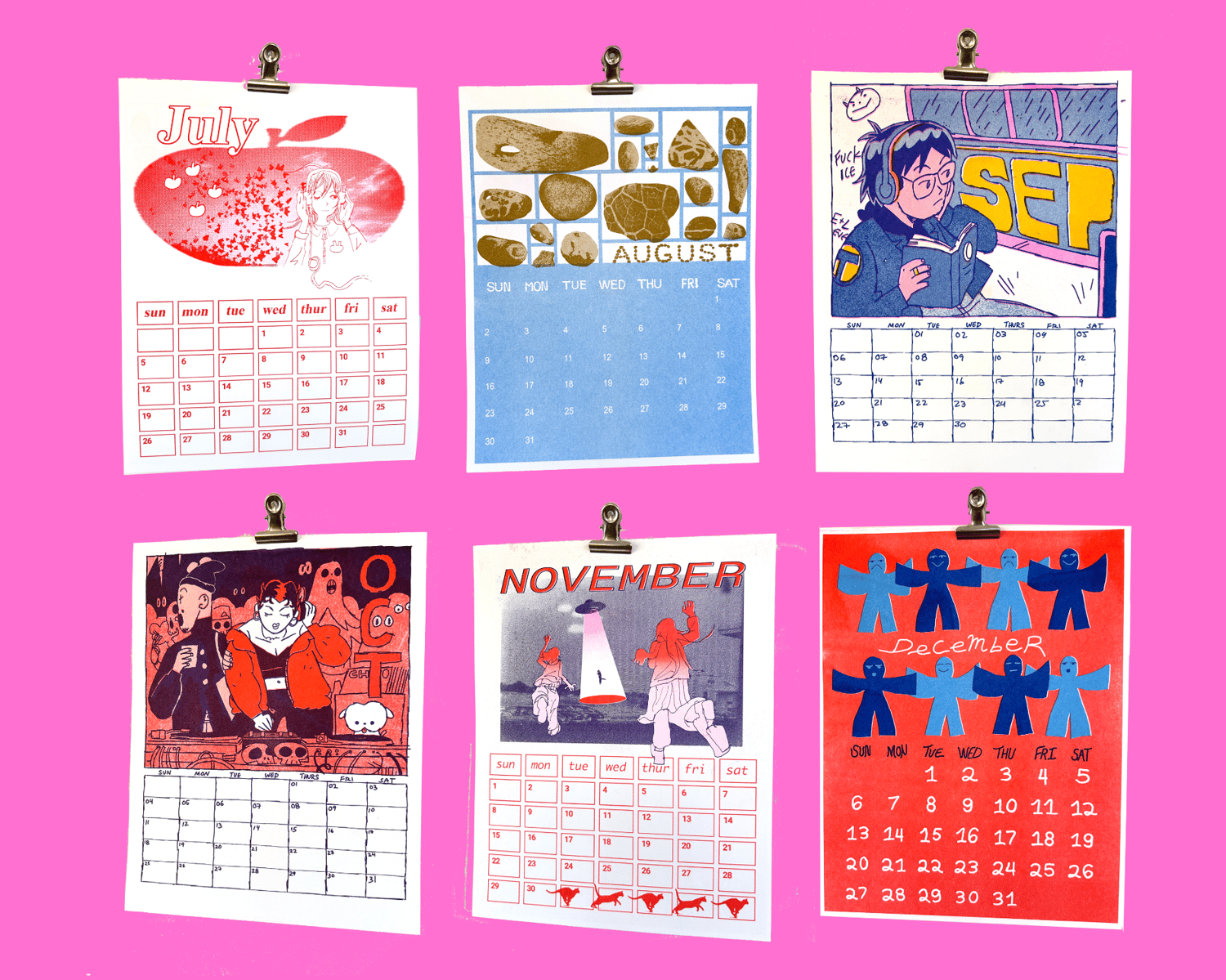 Our new 2026 letter-size riso calendar showcases art from all three of us, with all proceeds funding DRY Magazine Volume 2.